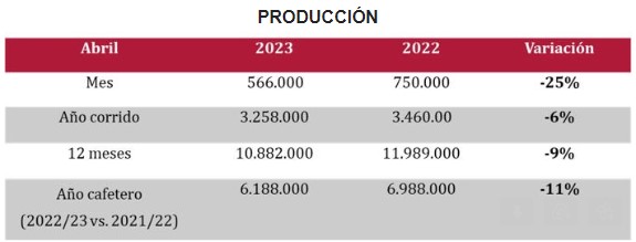 En abril, la producción cayó a 566.000 sacos de 60 kg, 25% menos frente a los 750.000 sacos registrados en el mismo mes de 2022.