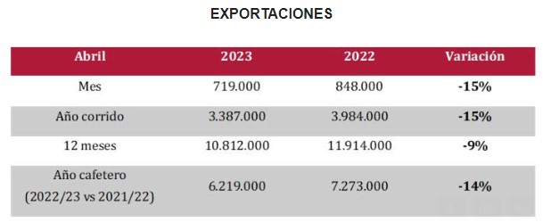En abril, las exportaciones cayeron 15% a 719.000 sacos de 60 kg de café verde desde los 848.000 sacos puestos en el exterior el mismo mes de 2022.