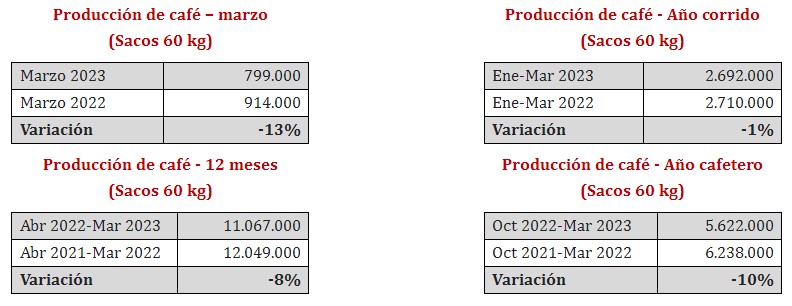 Y en lo que va del año cafetero (octubre 2022-marzo 2023), la producción superó los 5,6 millones de sacos, 10% menos frente a los 6,2 millones de sacos de igual lapso anterior.