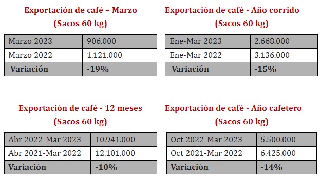 En marzo, las exportaciones cayeron 19% a 906.000 sacos de 60 kg de café verde desde los más de 1,1 millones de sacos puestos en el exterior el mismo mes de 2022.