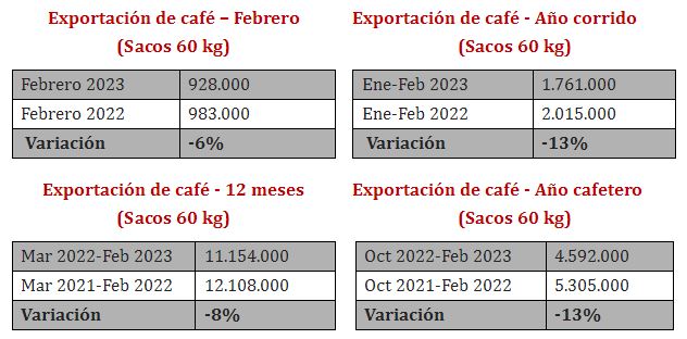 En febrero, las exportaciones disminuyeron 6% a 928.000 sacos de 60 kg de café verde desde los 983.000 sacos puestos en el exterior el mismo mes de 2022.
