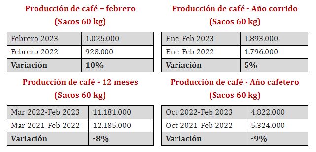 En lo corrido del año (enero-febrero de 2023), la producción aumentó 5% a casi 1,9 millones de sacos desde 1,8 millones en el mismo periodo del año pasado.